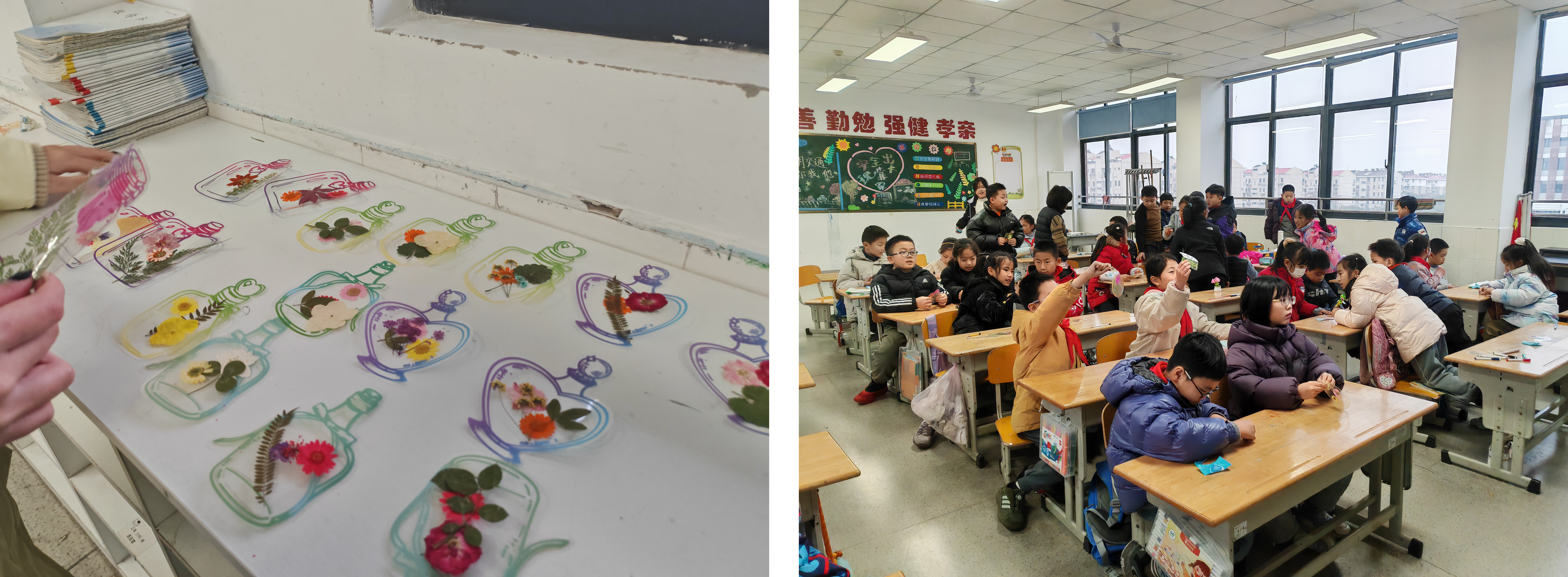 科普授课结束后,植物书签制作环节正式拉开帷幕。DIY手工社团成员化身“小导师”,为同学们分发干花、透明书签等制作材料,并耐心指导大家进行创意搭配。社团成员们手把手地传授技巧,鼓励孩子们发挥想象力,将自然元素与个性创意相结合。孩子们专注投入,时而相互交流想法,时而向“小导师”请教,一张张普通的卡纸在指尖蜕变为承载自然诗意的独特书签。