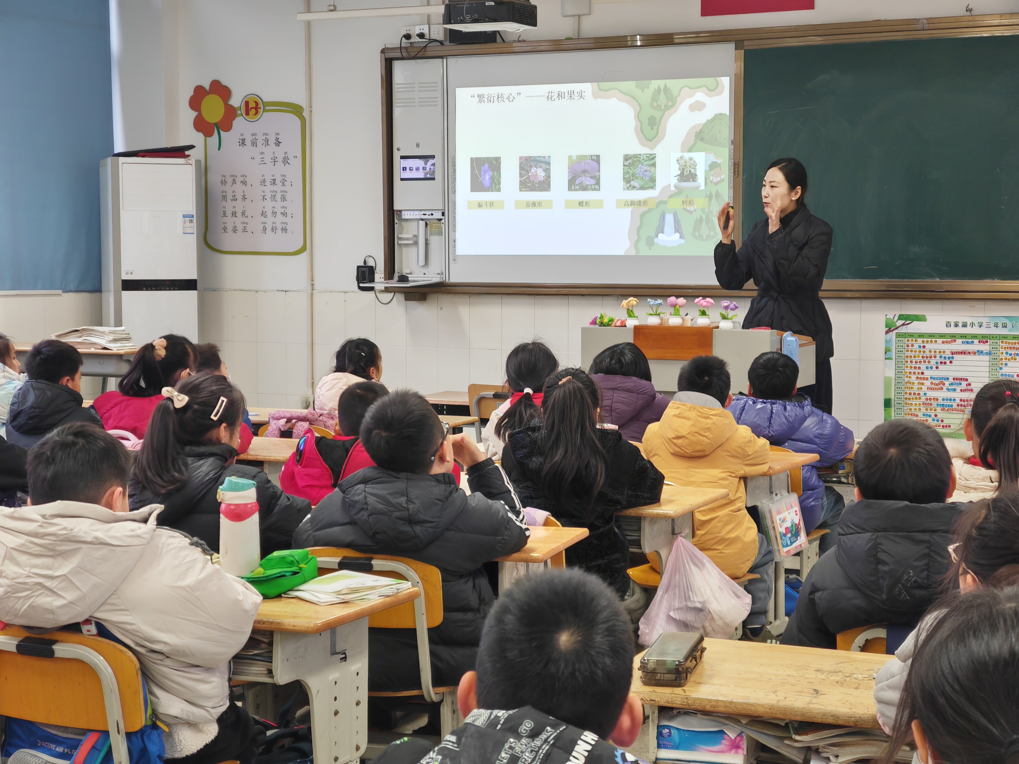 活动伊始,王春老师以“神奇的植物器官大冒险”为题展开授课,通过生动的图片、趣味问答与实物展示,介绍植物的茎、叶、花、果实等,以常见植物的生长习性与生态价值,将抽象的植物学知识转化为孩子们易于理解的生活案例。同时,还介绍了植物界的奇特现象,“蒲公英为什么要‘飞’”“猪笼草为什么会‘吃虫’?”同学们围绕提问积极互动,课堂氛围热烈而活跃,原本陌生的植物知识在轻松的交流中扎根心底。