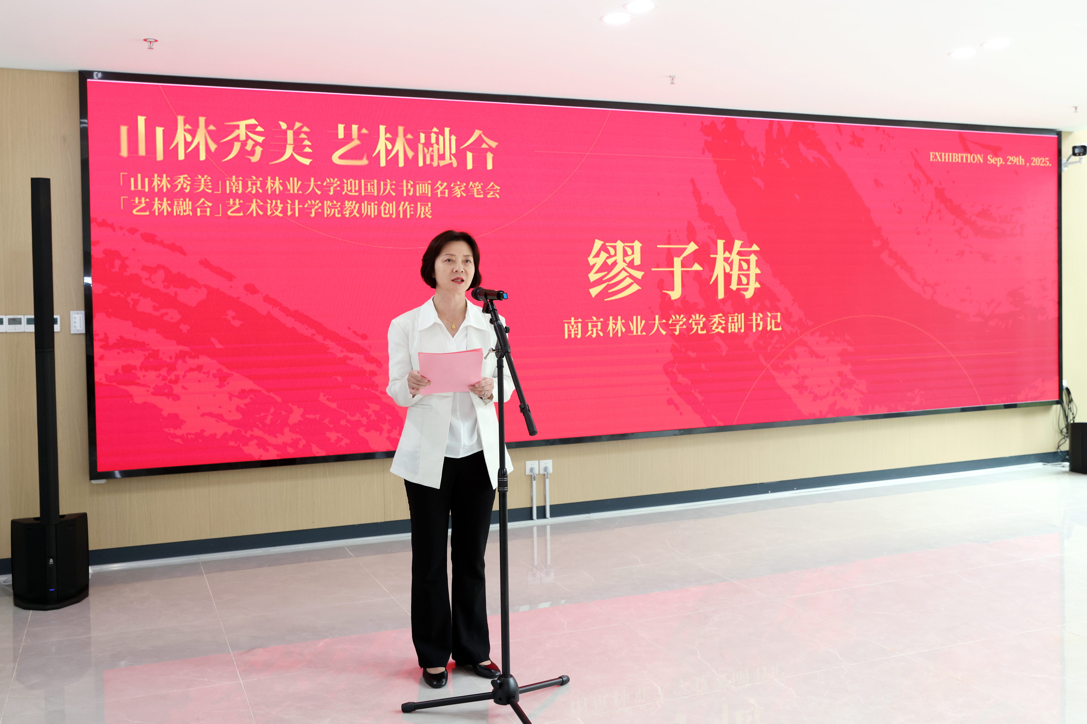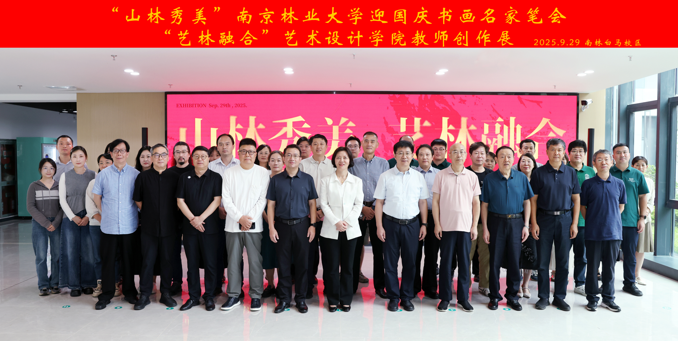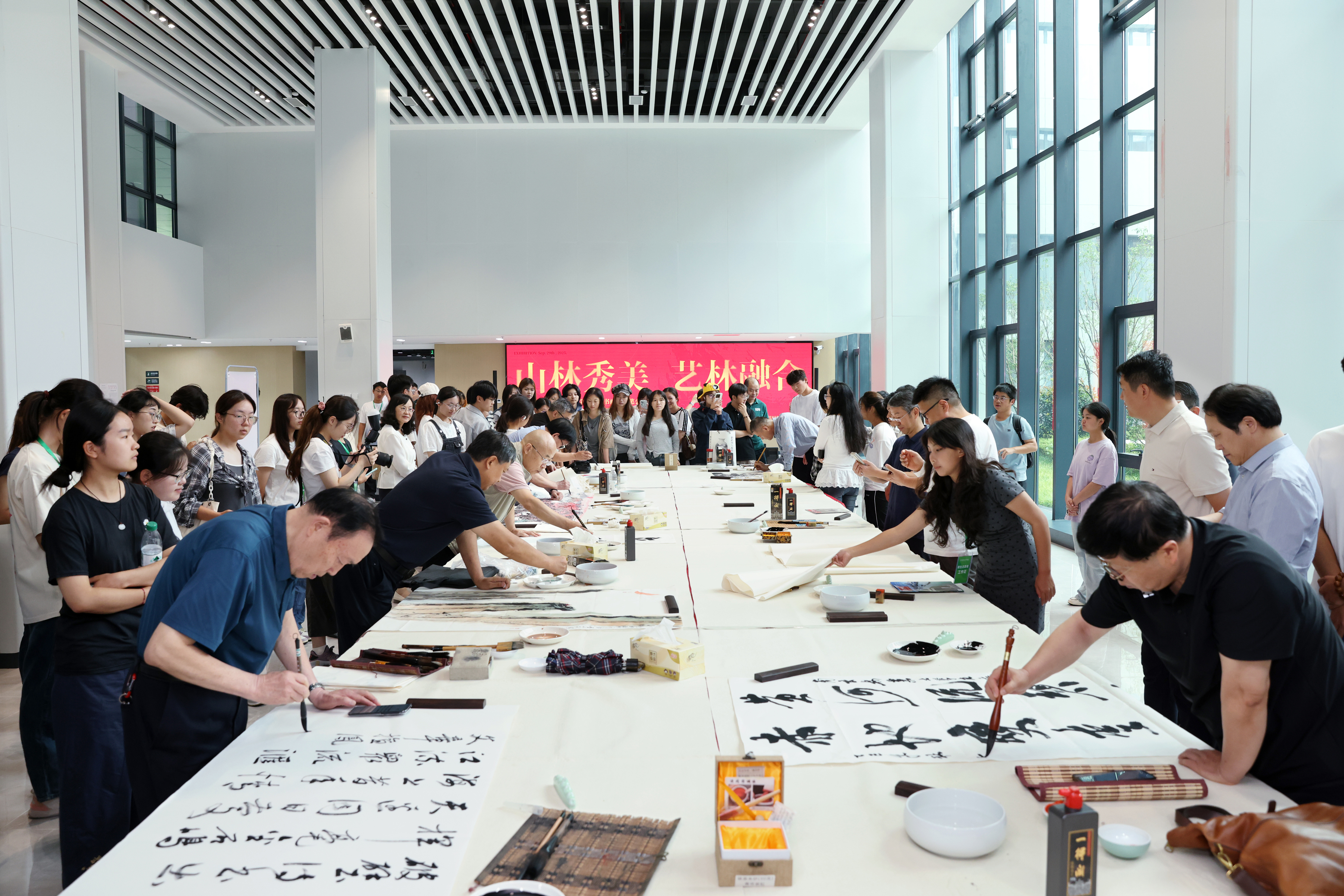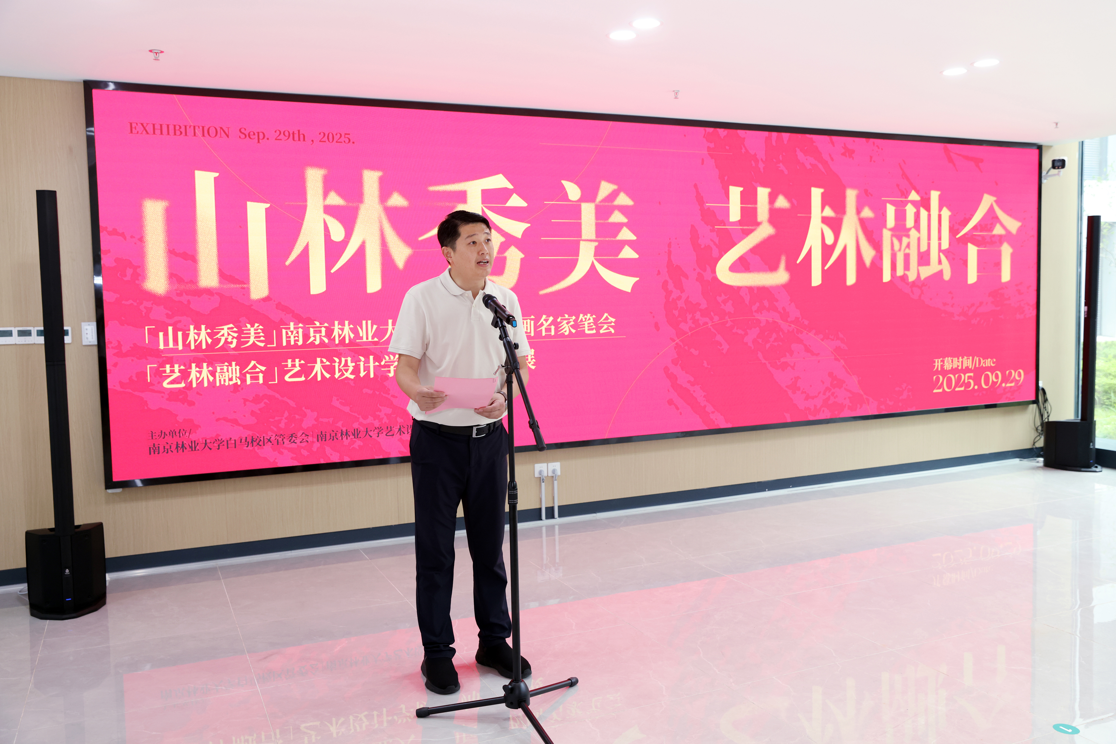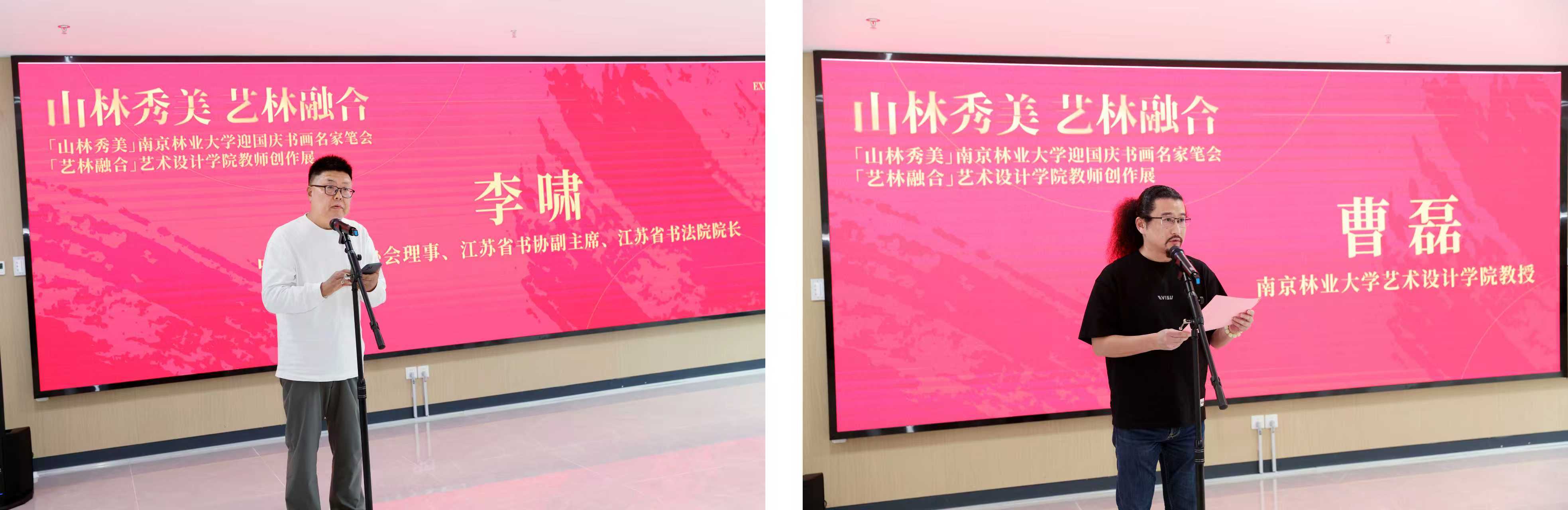 翰墨颂华章,丹青绘山河。9月29日上午,我院和白马校区管委会在白马校区联合举办“山林秀美”迎国庆书画名家笔会与“艺林融合”教师创作展。校党委副书记缪子梅,校党委常委、党委宣传部、党委统战部部长董博,白马校区党委常务副书记、管委会常务副主任徐新洲,南京国家农高区党工委书记徒位国,中国书法家协会理事、江苏省书协副主席、江苏省书法院院长李啸,中国书法家协会理事、江苏省书法家协会副主席仇高驰,中国书法家协会理事、江苏省书法家协会副主席黄正明,江苏省书法家协会原常务理事、江苏省直书法家协会名誉主席汪寅生,江苏省书法家协会理事、江苏省书法家协会驻会秘书长纪松,江苏省书法家协会理事、江苏省直书法家协会副主席、江苏省青年书法家协会第三届副主席、江苏省硬笔书法家协会主席吴勇,南京市文化和旅游局原副局长、南京书画院、金陵美术馆书记尤荣喜,江苏省中国画学会理事、江苏省美术家协会美术教育艺委会委员高顺岭,法国巴黎美爵艺术基金会中国区秘书长、美国加州美中文化交流中心副主任兼中方代表林敦席,南京林业大学艺术设计学院兼职教授、江苏省美术家协会会员、江苏省花鸟画研究会会员、江苏山水画研究会会员刘越胜出席活动。