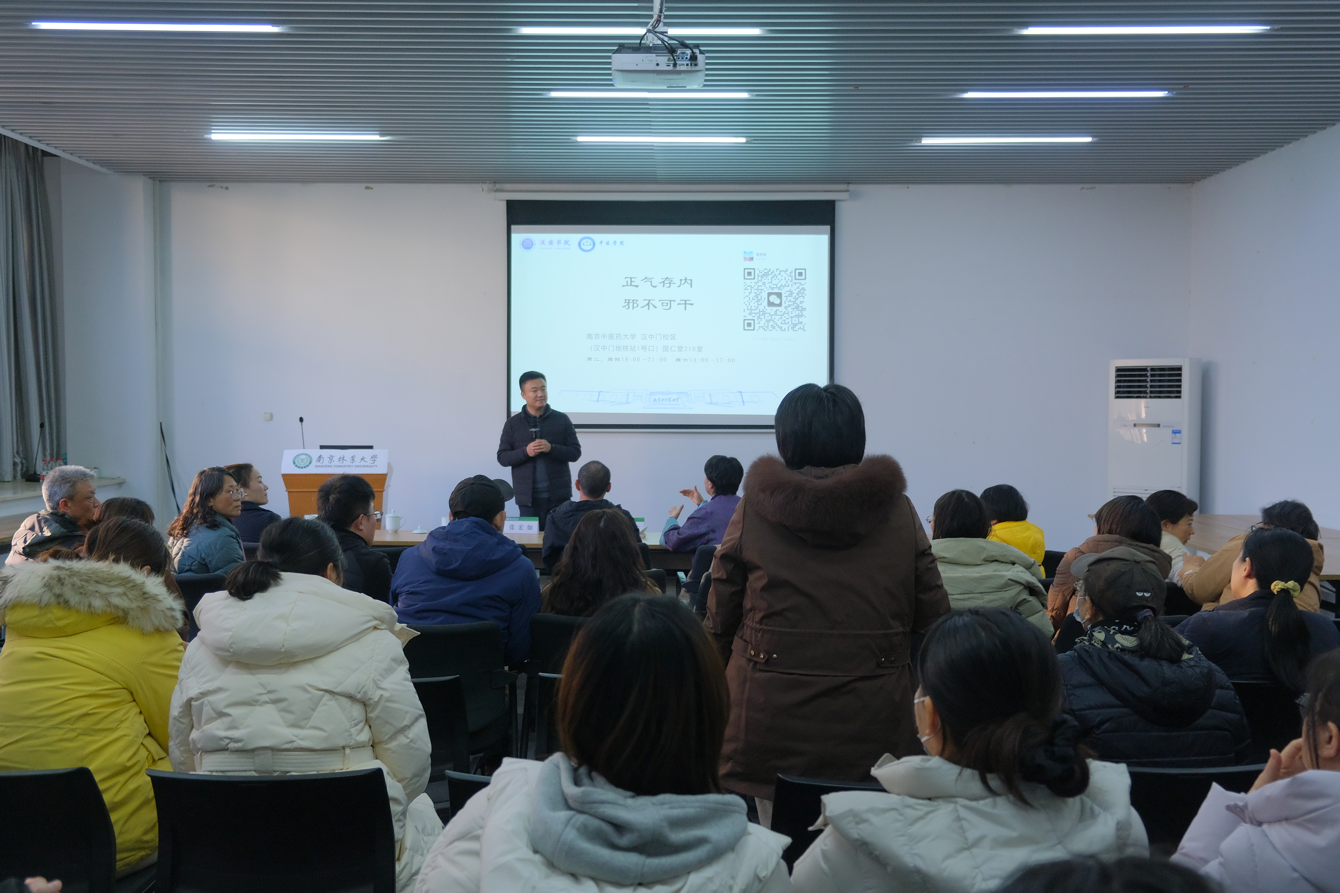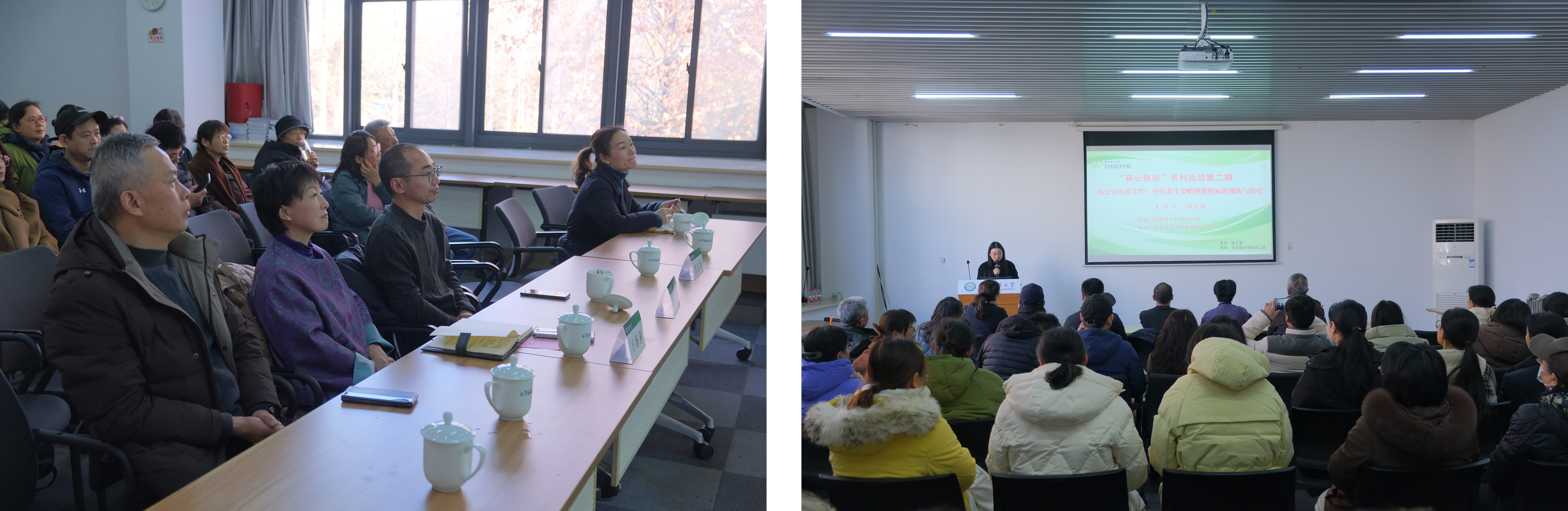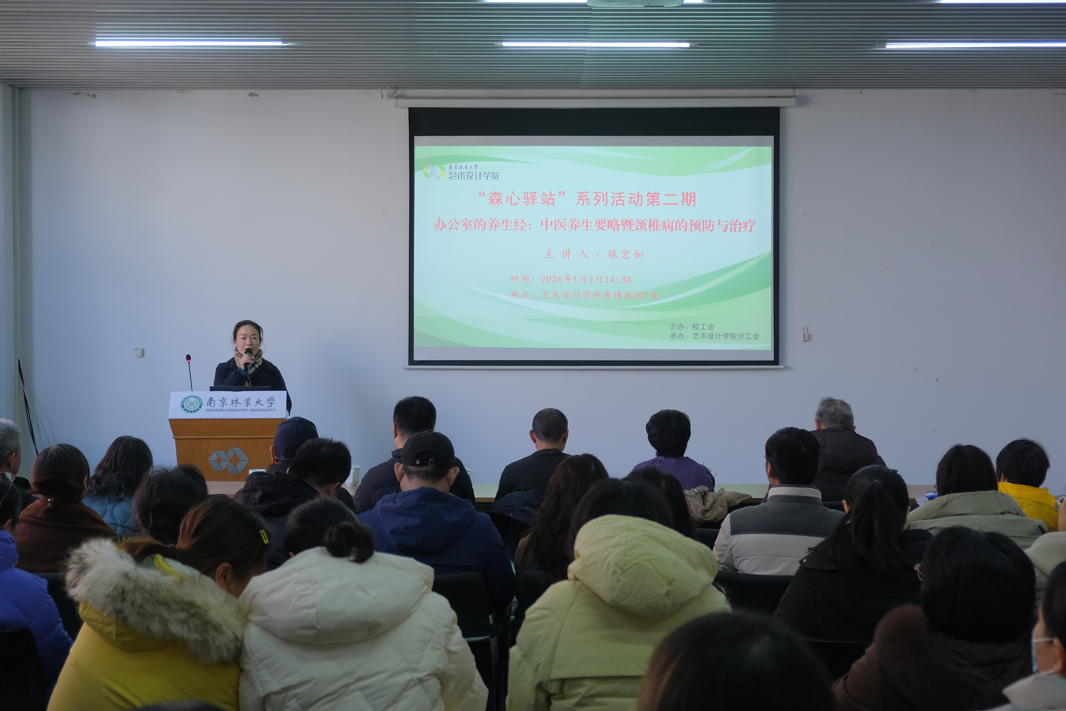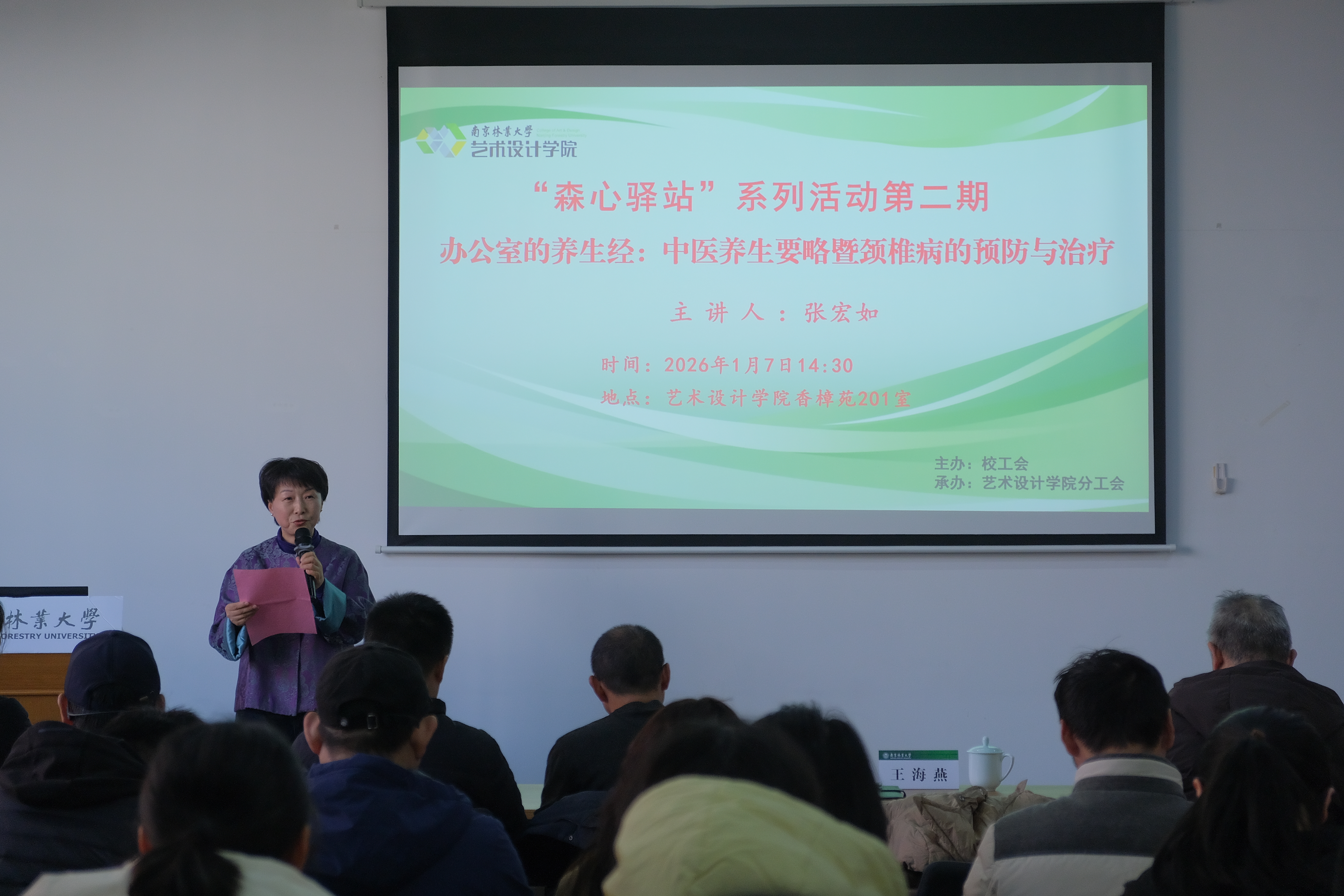 为进一步提高广大教职工健康素质,关爱教职工身心健康,营造积极健康、充满活力的校园文化氛围,1月7日下午,由校工会主办、艺术设计学院分工会承办的“森心驿站”健康护航·赋能新程系列活动第二期——“办公室的养生经:中医养生要略暨颈椎病的预防与治疗”专题讲座,在香樟苑201室顺利举行,南京中医药大学、中医学院副院长张宏如教授主讲,校工会副主席马龙华、办公室主任王海燕及各学院教职工代表共同参与,活动由艺术设计学院辅导员朱婷主持。