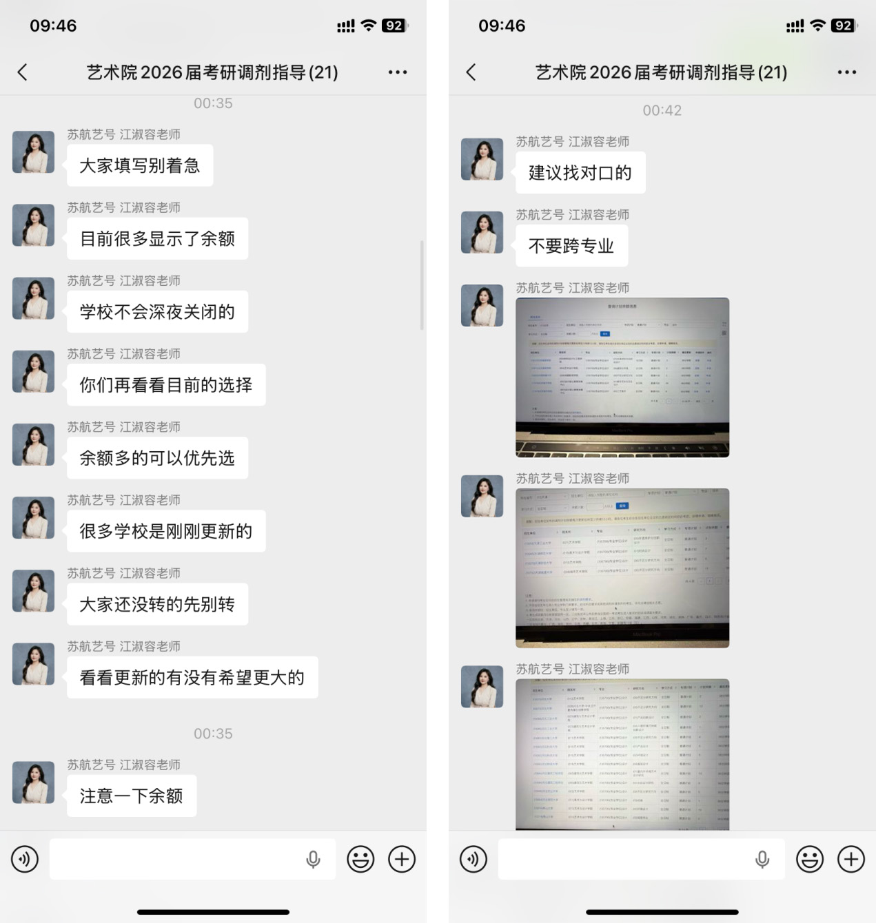 4 月 8 日凌晨,调剂系统开放后,江淑容老师便第一时间投入到指导工作中。她全程陪伴同学们逐一对接调剂院校,手把手指导学生筛选匹配院校、核对报名信息,从院校缺额情况、专业适配度到调剂系统操作细节,都逐一细致讲解,帮助同学们精准锁定目标院校。深夜时分,为了让每一位有疑问的学生都能及时得到解答,江老师依旧坚守在屏幕前,不辞疲倦地回复消息、梳理调剂数据,用耐心与专业为学子们筑牢升学防线。