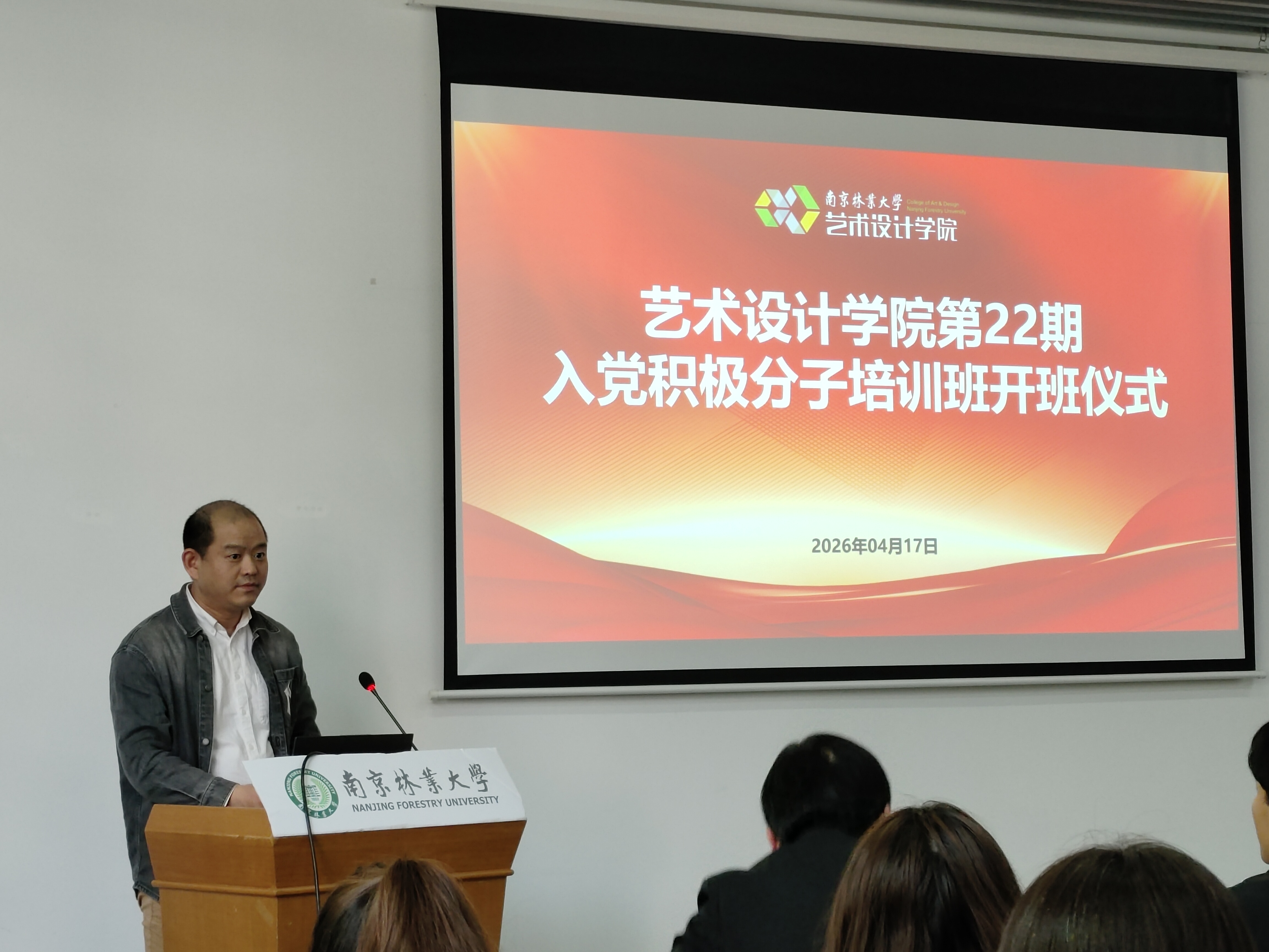 2026年4月17日,艺术设计学院第22期入党积极分子培训班开班仪式暨第一次党课培训在香樟苑201会议室顺利举行。学院党委副书记、副院长陈健,学院组织员黄浩,部分党员代表及全体培训班学员参加本次活动。开班仪式由黄浩主持。