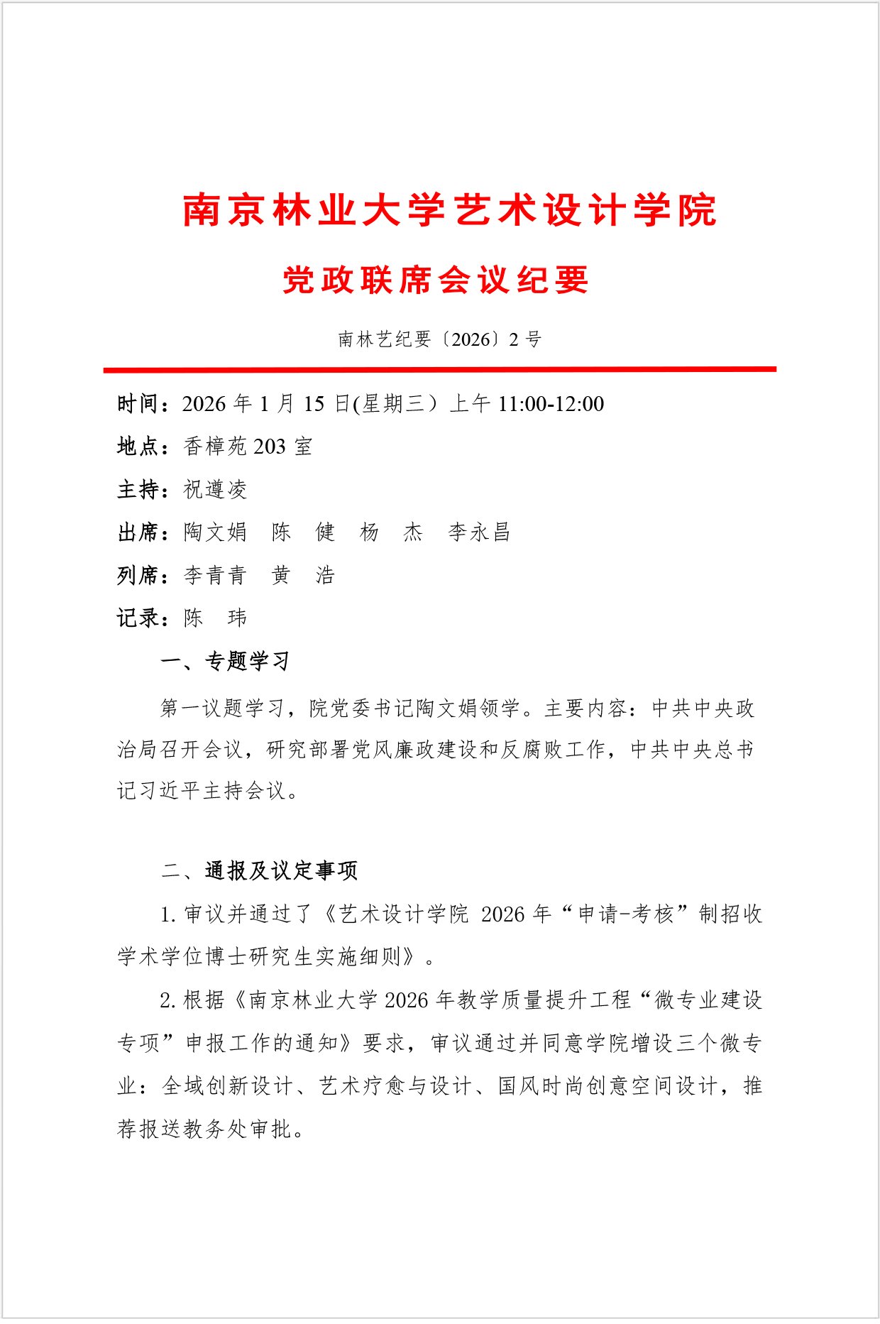 南京林业大学艺术设计学院党政联席会议纪要【2026】2号
