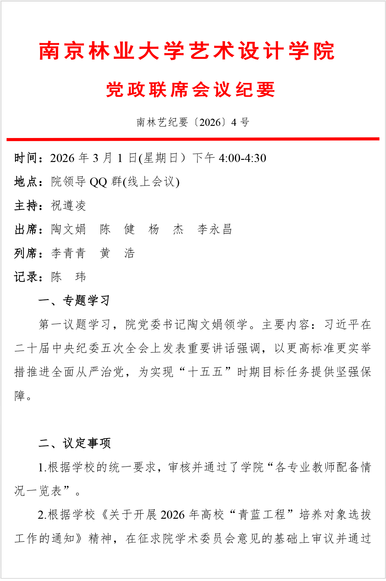 南京林业大学艺术设计学院党政联席会议纪要【2026】4号
