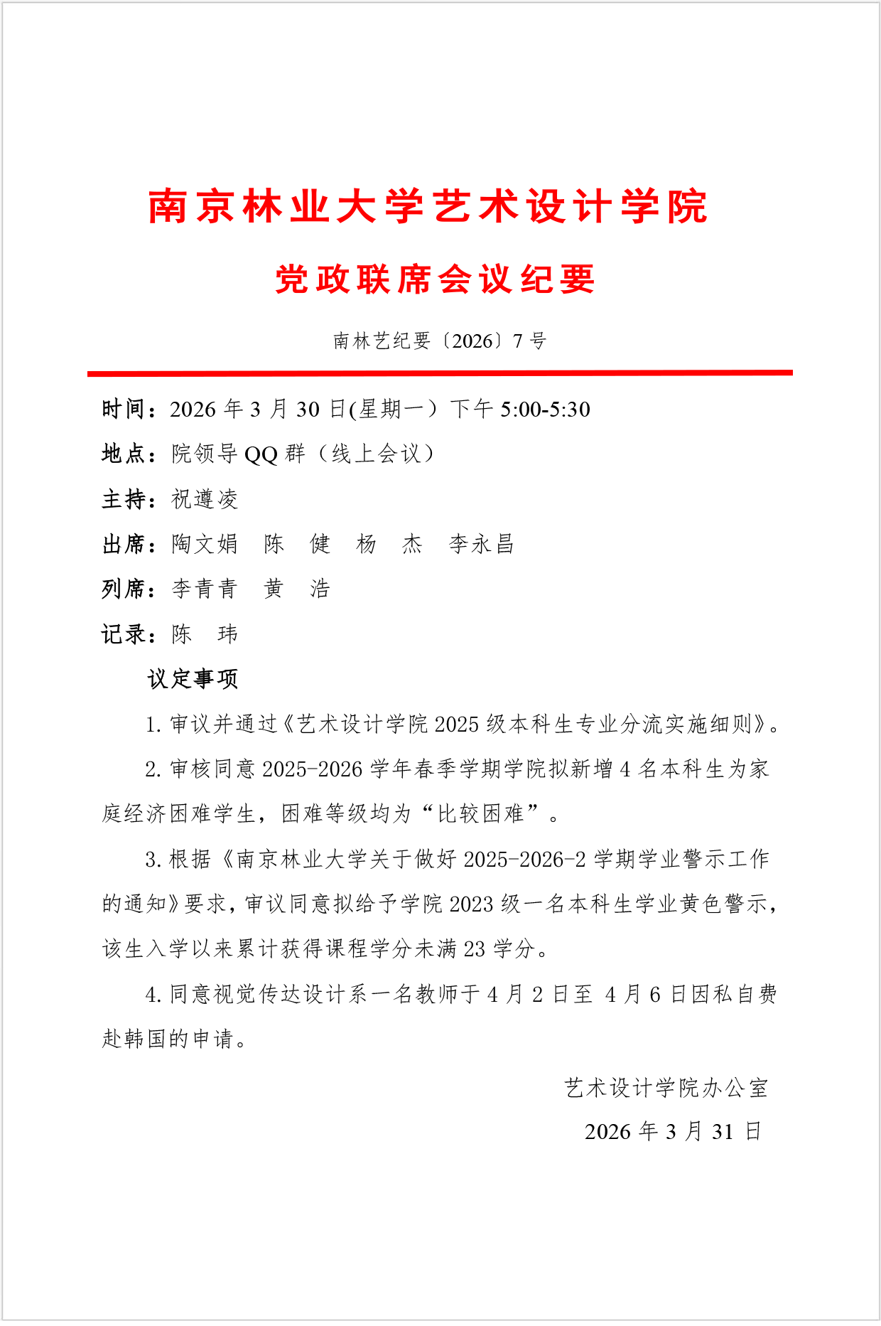 南京林业大学艺术设计学院党政联席会议纪要【2026】7号